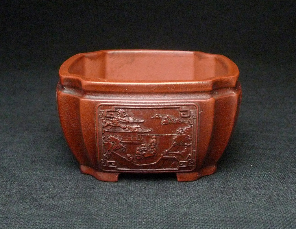 【進口紫砂盆】摹古 红清水泥 -古城圖 - 束口切角方盆07 03