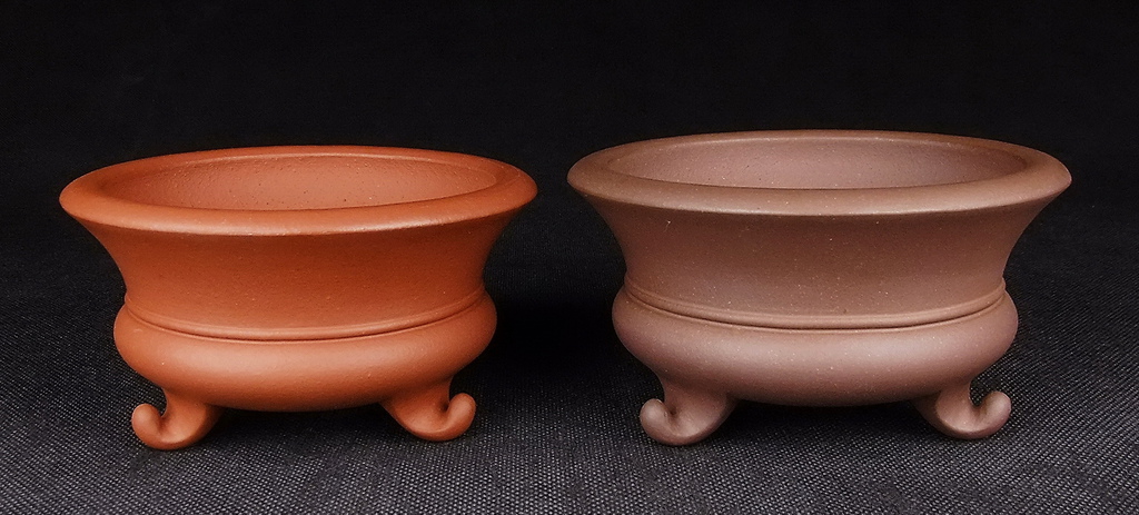【盆缽收藏】 展覽級 名家純梨皮朱泥 卷腳三足圓盆