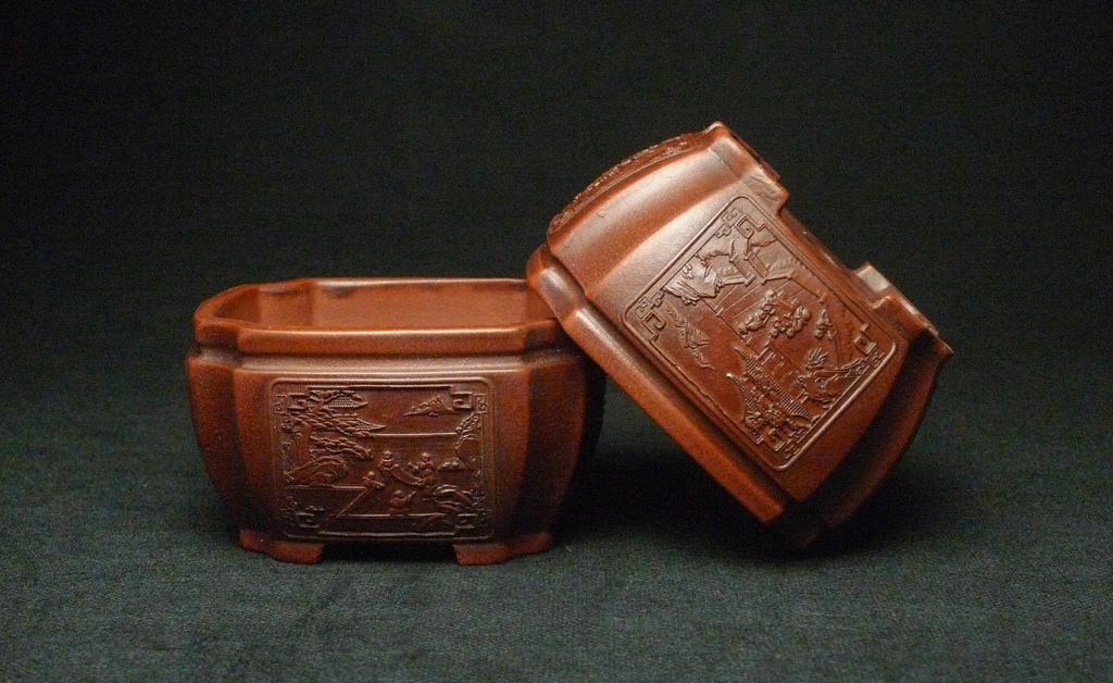 【進口紫砂盆】摹古 红清水泥 -古城圖 - 束口切角方盆07 03