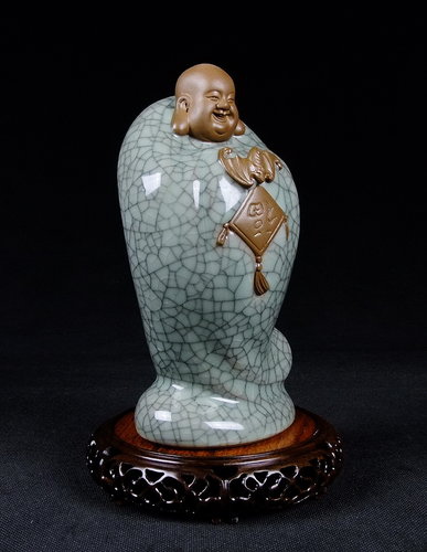 哥窯 紅陶青瓷鐵線開片 7吋彌勒佛‧福在眼前 尺寸 12 x 9 x 21.5cm