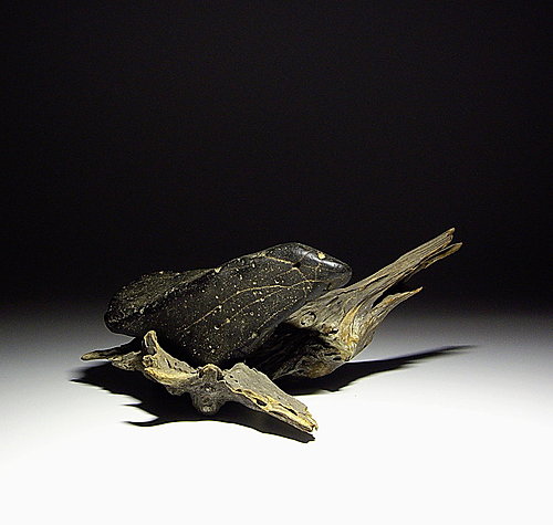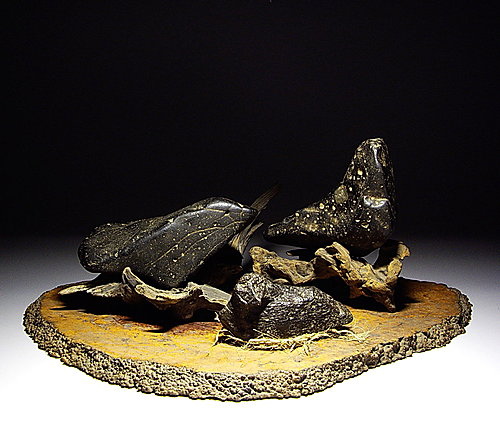 蛙嗚鳥語‧鳥族全家福、本組關西黑石、由一雄鳥‧一雌鳥‧一幼鳥三隻飛鳥組成!右方